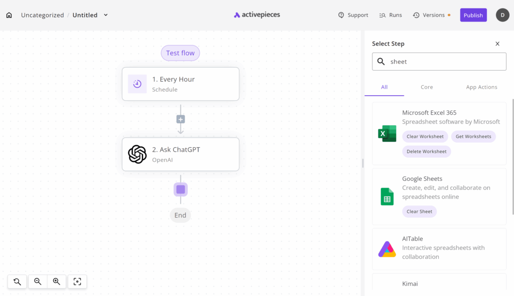 In the workflow builder, Activepieces highlights capabilities that have become standard in modern automation: loops, branches, automatic retries, HTTP calls, and the ability to run code using NPM. It also emphasizes that workflows are versioned, which helps when automations evolve and you need to audit changes or roll back safely.