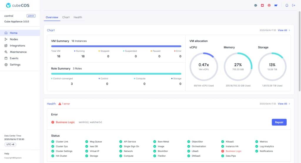 In the official documentation, Bigstack describes CubeCOS as an SDDC (Software-Defined Data Center) solution that combines the control of a self-hosted private cloud with capabilities typically associated with public clouds. It also highlights the ability to integrate with higher-level services in its ecosystem (such as VDI, edge computing, or AI workloads). The company further claims clusters can scale horizontally without downtime—a direct message to organizations that fear scaling will require constant maintenance windows.