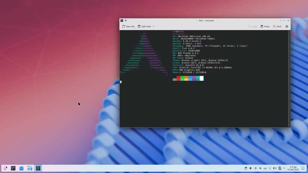 The first boot into ObsidianOS KDE looks and feels like a well-tuned Arch desktop. Plasma is close to vanilla, with no heavy theming or aggressive UI overhauls. The application launcher, system settings and default tools are what you’d expect if you’d set up Arch with KDE yourself.