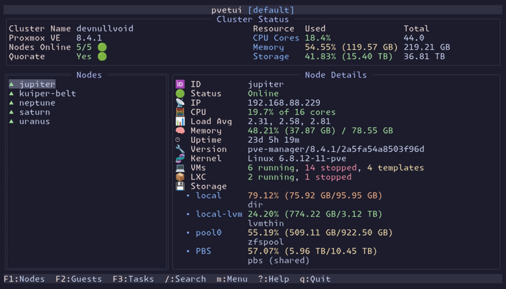 pvetui describes itself as a Terminal User Interface for Proxmox VE. In plain terms: a console app that connects to one or more Proxmox servers/clusters and provides views to manage nodes, virtual machines, containers, and cluster resources.