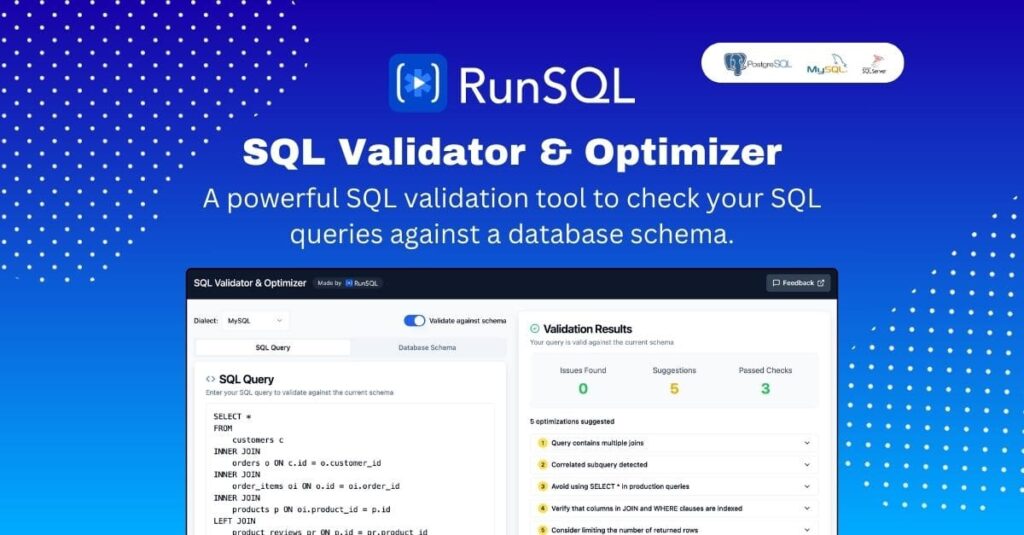 With SQL Validator, RunSQL strengthens its position as a free, accessible, and collaborative playground for databases. By catching errors early and encouraging performance-aware practices, it empowers developers and students alike to write cleaner, more efficient queries.