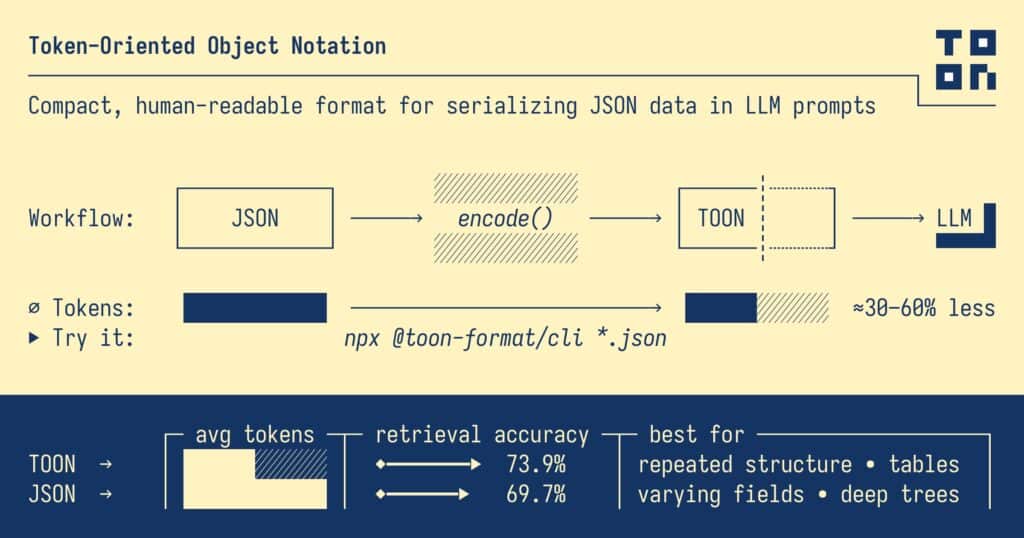 The Large Language Model ecosystem has been looking for ways to pack more data into fewer tokens. JSON is the de facto standard for representing complex structures, but it’s also noisy, repetitive, and expensive when sent to an LLM. That’s exactly the problem TOON (Token-Oriented Object Notation) sets out to solve: an open format designed specifically for AI prompts that promises to cut token costs and improve model comprehension without giving up JSON’s structure.