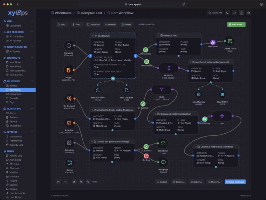 To address that, xyOps includes a graphical workflow editor where teams can connect events, triggers, actions, and monitors into pipelines that are easier to reason about and maintain. Visual tooling isn’t automatically better than code, but for many ops teams it reduces the “tribal knowledge” problem—where a small set of people understand the automation because they wrote the scripts years ago.