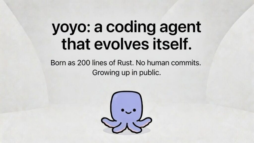yoyo is an open-source coding agent written in Rust that improves its own code in automated cycles. It has attracted attention because it publishes its evolution in public and has grown from a 200-line prototype into a much larger and more capable terminal tool.